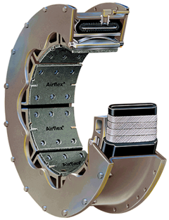 气胎内缘装有摩擦块,在高速转动时,压缩空气作用下,使得摩擦块压紧钢制内鼓轮,从而产生摩擦力,传递扭矩。这种气胎离合器一般安装在外部,布置比较自由,尺寸也没有严格的限制,检修也更加方便。气胎离合器是以压缩空气为操纵动力源的摩擦离合器。所应用的范围是需要传递较大的转矩和运转速度较快的地方,如船舶、石油钻井机械、挖掘机、球磨机等等。且气胎离合器的结构紧凑,传递转矩大,吸振,使用寿命长,接合平稳,结构紧凑,从动部分惯性小等等,气胎离合器使用温度不能高于60℃也不能低于-20℃。