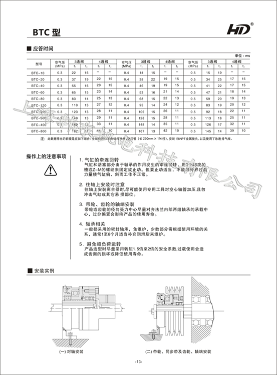 1. BTC型(齿合式)离合器是由两枚平面齿盘在通气时 内部轴向移动来齿合连接,泄压时由复位弹簧自动分离。