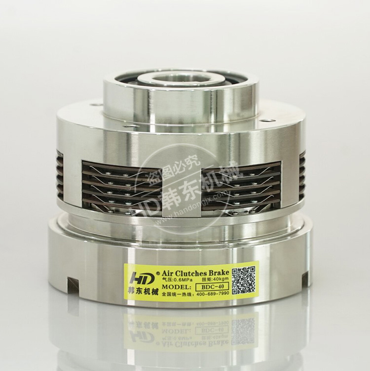 BDC型离合器主要由气缸、活塞、精密轴承、碟簧组、铜基摩擦片、钢片等组成。气缸和活塞是离合器的动力源泉,良好的密封效果使得离合器结合迅速,传递扭矩理想;精密轴承起到了分离刚体和旋转轴的作用,本公司采用的是国际*轴承生产商NSK的轴承;碟簧组能够在断气情况下使摩擦片与铜片顺利分离;铜基摩擦片和钢片组有着很好的摩擦效果。