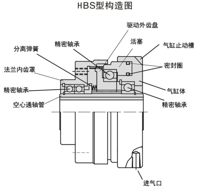 HBS型离合器主要由气缸、活塞、驱动外齿盘、传动内齿盘、复归弹簧组成。气缸和活塞靠密封圈来密封,密封性能决定了离合器的性能;内外齿的啮合可以很好的传递扭矩,也起到了很好的防尘作用;复归弹簧使得内外齿盘能够顺利脱离。