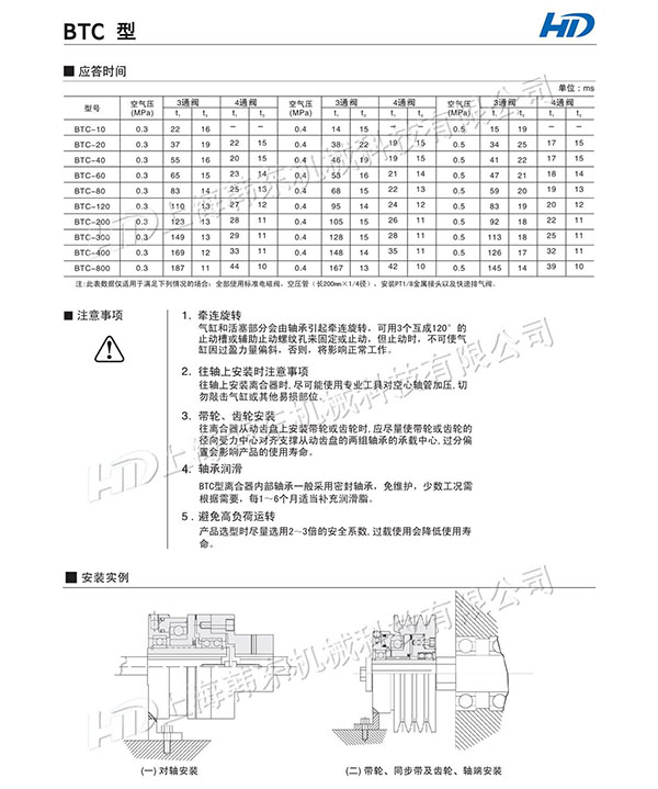 1、BTC齿式离合器是由两枚平面齿盘在通气时内部轴向移动来齿合连接,泄压时由复位弹簧自动分离。